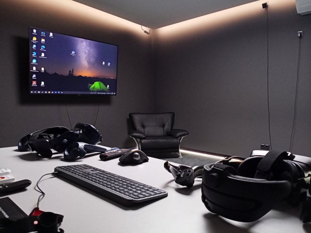 Wir bei Flavia haben unseren VR-Raum dunkel gestrichen und mit indirekter Beleuchtung versehen. Ein solcher Aufwand ist zwar nicht nötig, macht aber einen guten Eindruck, falls Sie Ihre VR-Anwendungen häufig Externen präsentieren!
